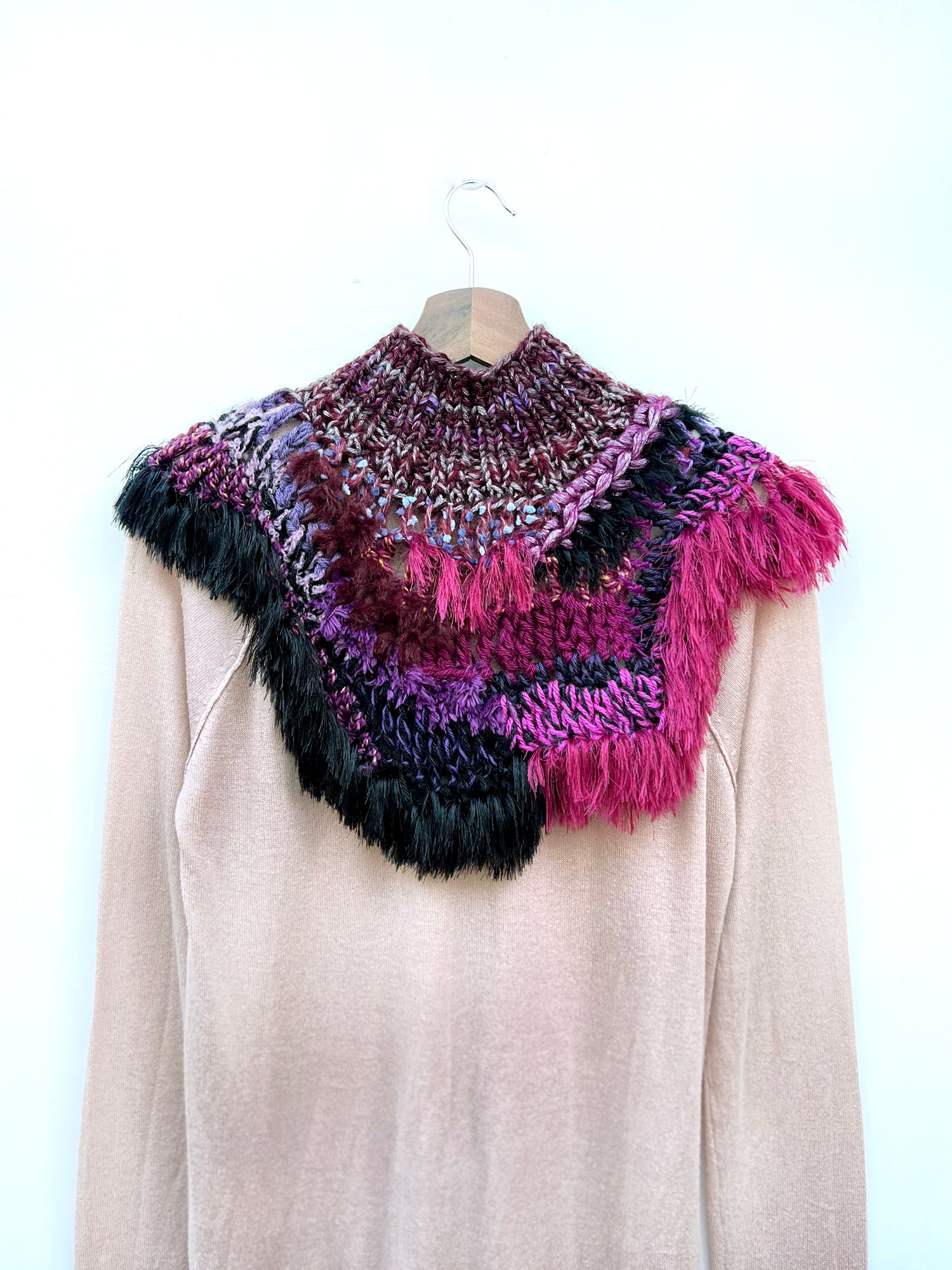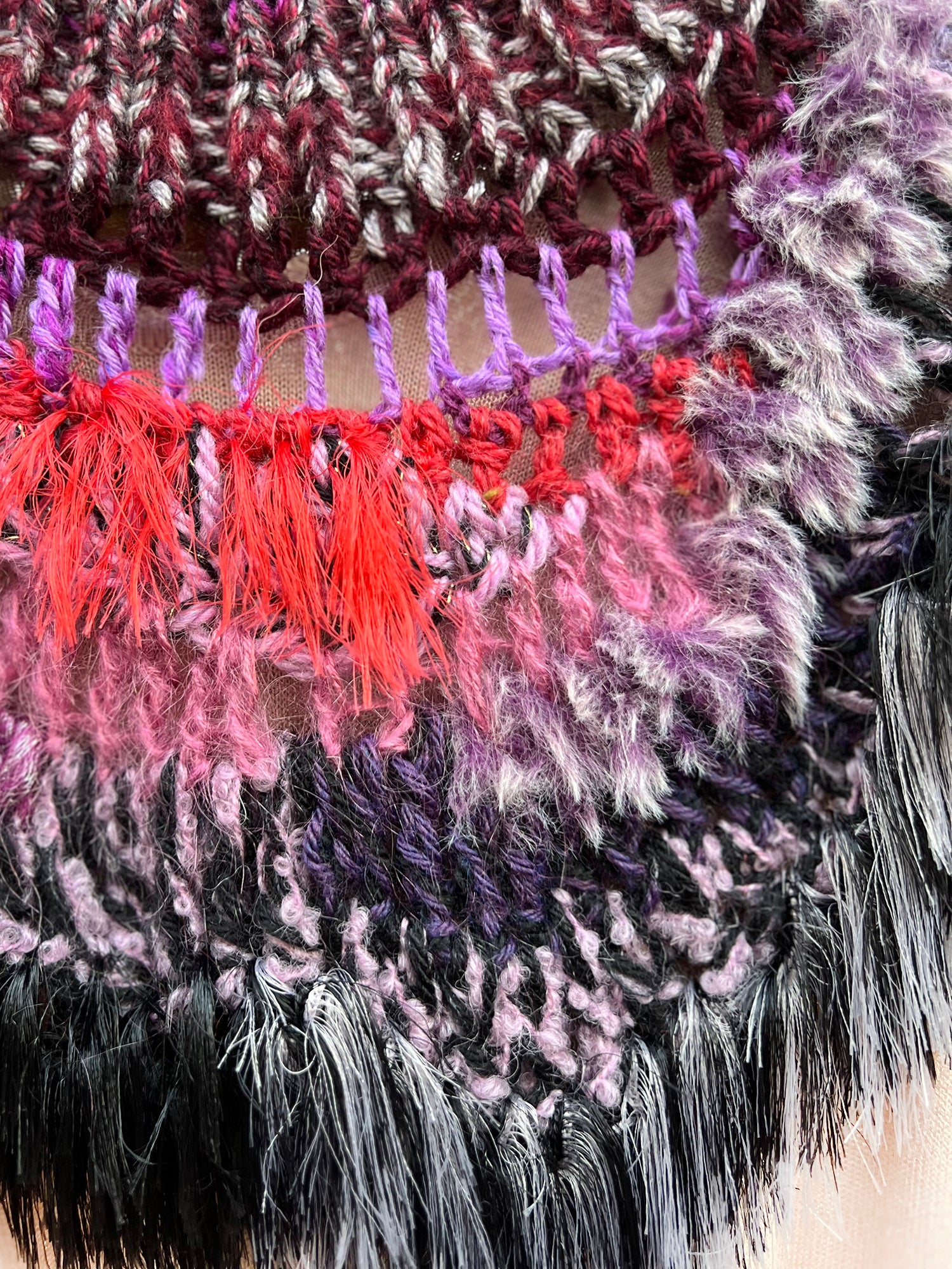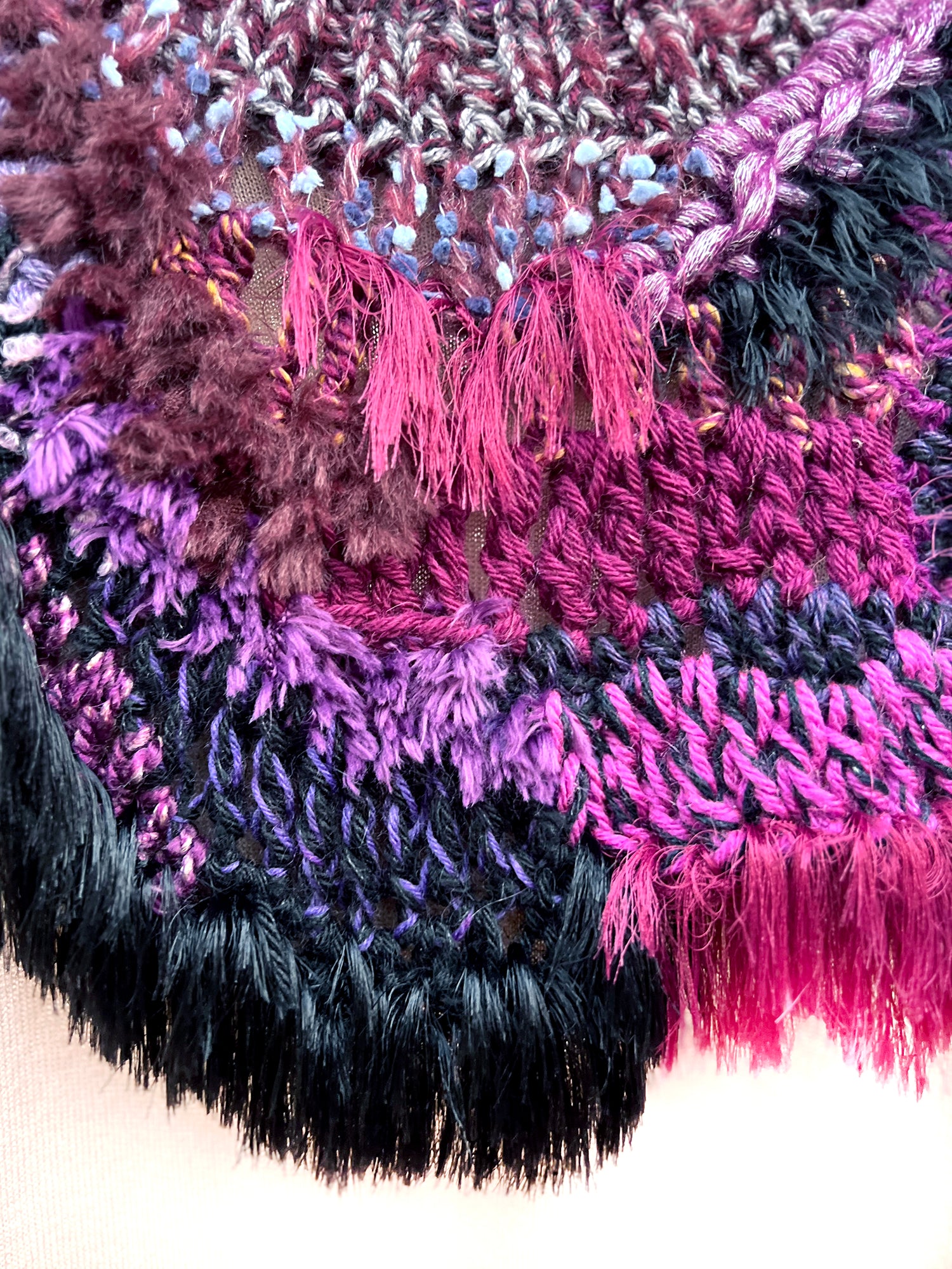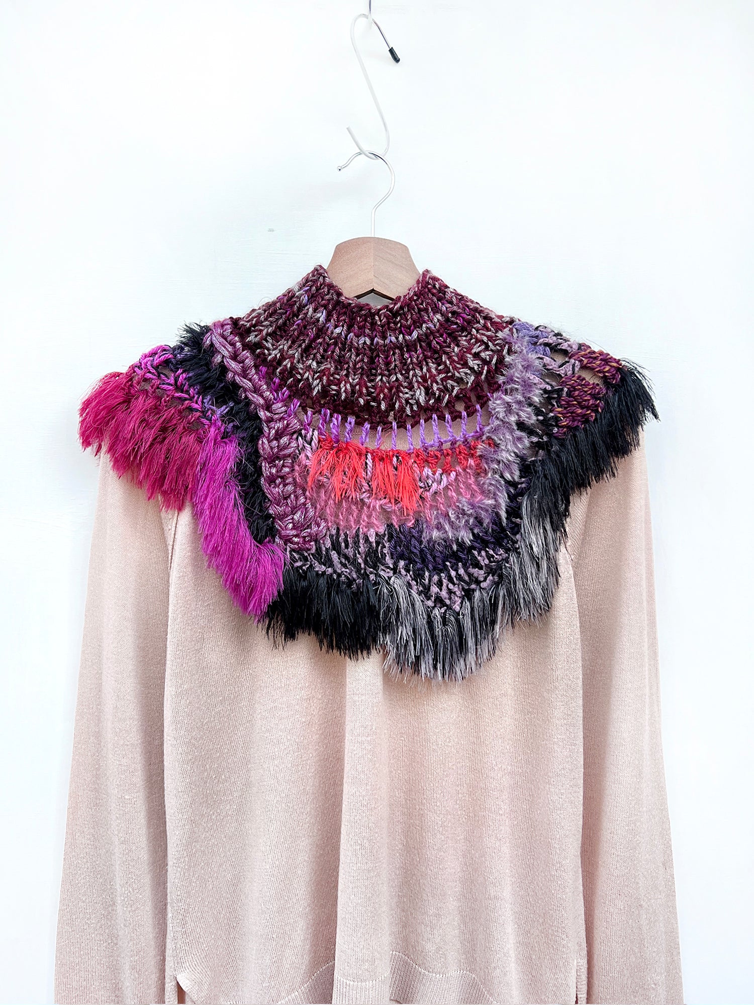 Envuélvete en este collar artesanal único y siente la calidez de algo verdaderamente especial. Hecha a mano con una lujosa mezcla de hilos de textura suave, un toque de piel sintética y flecos sutiles, esta pieza está diseñada para atesorarse durante años.