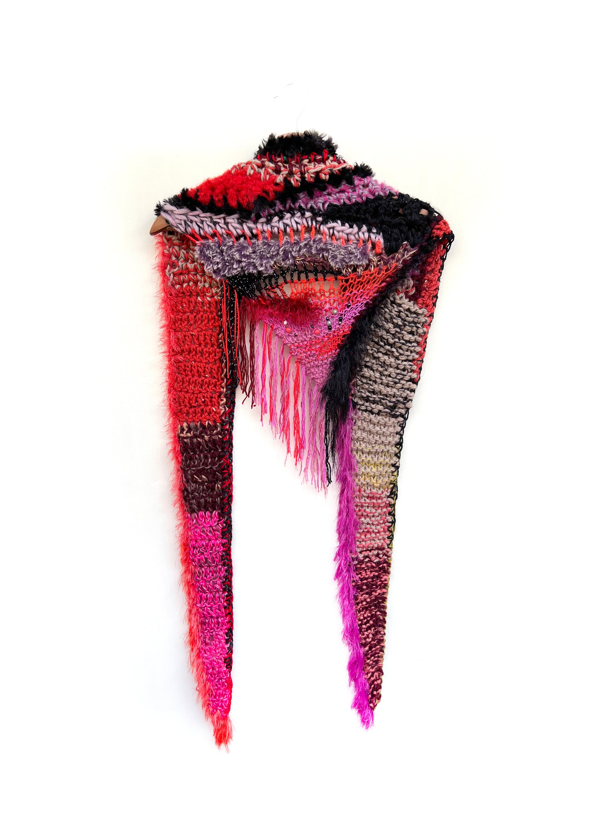 Una bufanda triangular atrevida y única que se siente como una obra de arte portátil: suave, texturizada, salvaje y llena de personalidad.