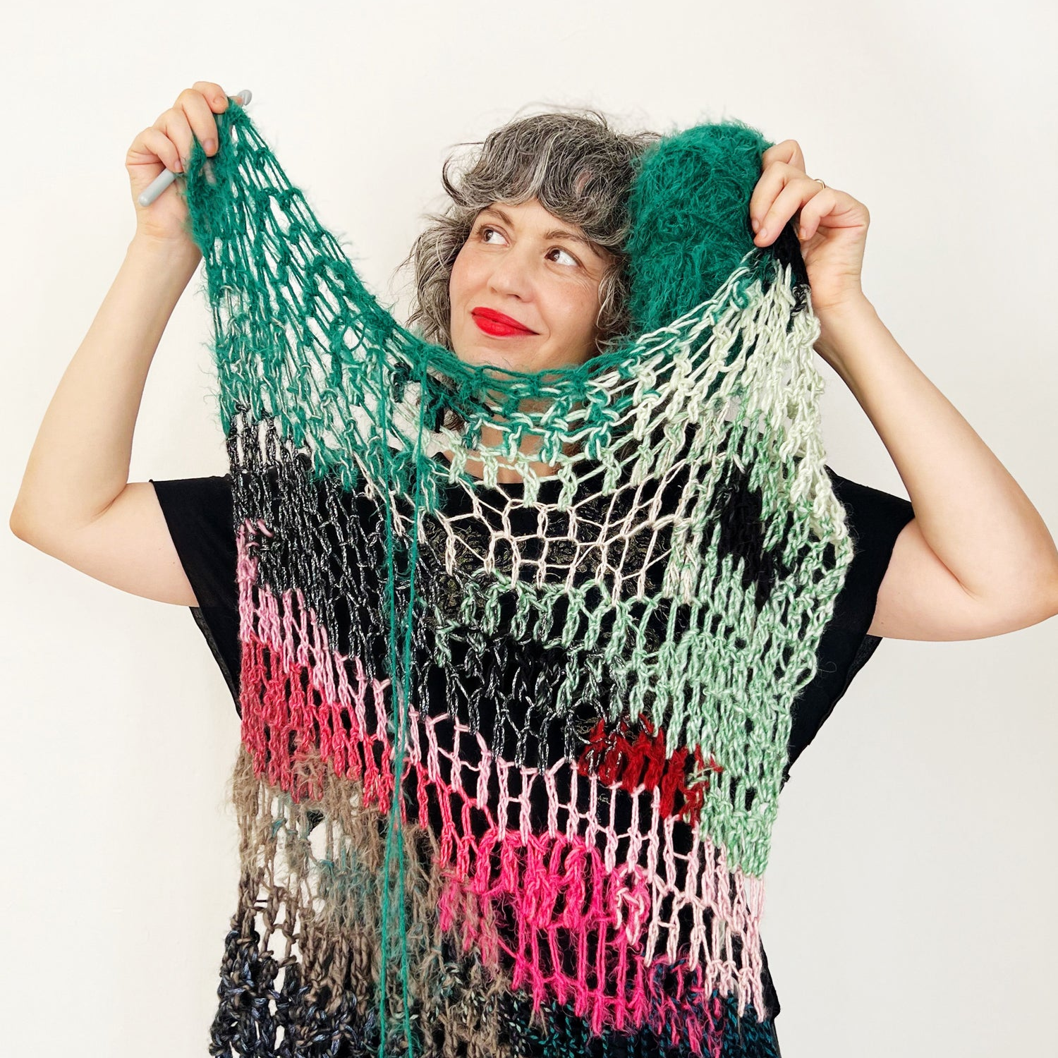 I’m so in love with this course and what I am creating as a result. Aluma’s teaching is gentle but bold, freestyle but engineered, quirky and freeing!! It’s like painting with yarn! My friends and family and I are going to get the craziest, funnest items to wear.