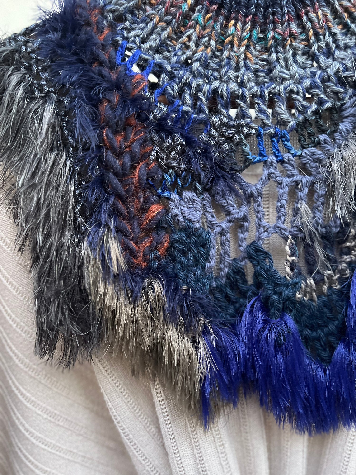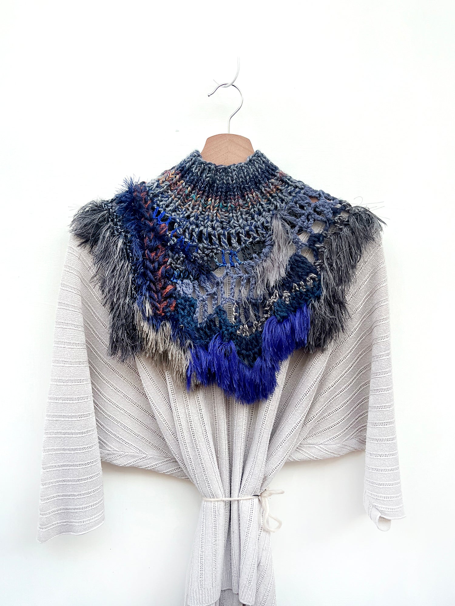Wrap yourself in this one-of-a-kind artisan neckpiece and feel the warmth of something truly special. Handmade with a luxurious mix of soft textured yarns, a touch of faux fur, and wispy fringe, this piece is designed to be worn and cherished for years to come.